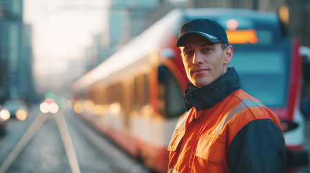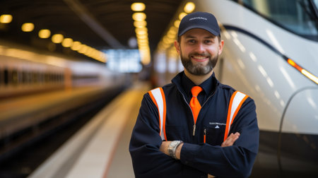 Conductor smiling during golden hour near train station preparing for departure Generative AI