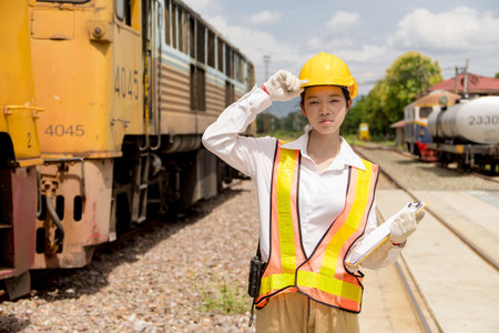 Portrait Asian young teen engineer worker work in Train station, Locomotive service station work control operate locomotive checkup maintenance