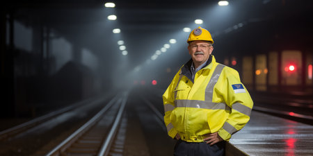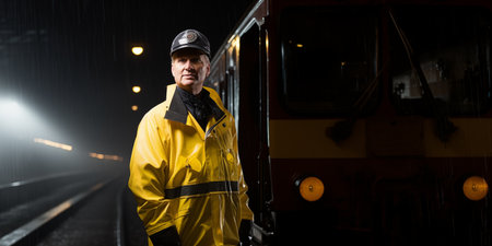 A senior train operator in traditional uniform and rain gear, standing on a wet platform with steam rising and golden station lights providing a dramatic ambiance. AI-generated