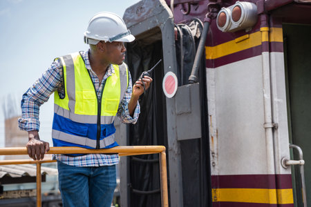 Railway Engineer Using Walkie-Talkie Near Train, African American Industrial Worker with Communication Radio, Railroad Supervisor in Safety Gear on Duty