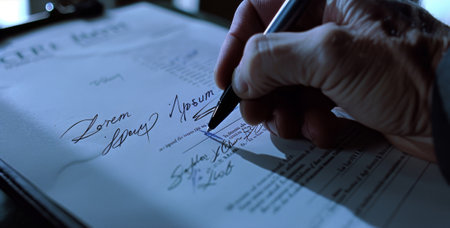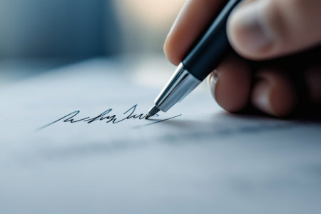 A close-up view captures a hand holding a pen, carefully signing a document with a bold signature. The setting conveys a sense of professionalism and significance in the act.