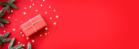 Gift box with a red bow spruce branches on a red background. New Year or Christmas banner text Merry christmas . Flat lay top view