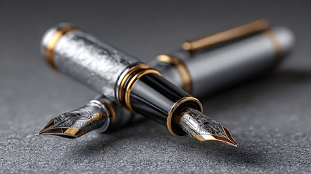 Two elegant fountain pens with intricate silver and gold details rest on a textured surface, showcasing their craftsmanship and inviting writers to create
