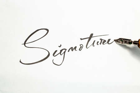 Signature word handwritten with a dip pen on white paper