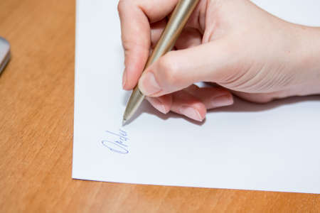 Close up hand with pen writes on paper on desk