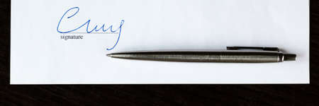 closeup of the signature and pen on a document paper