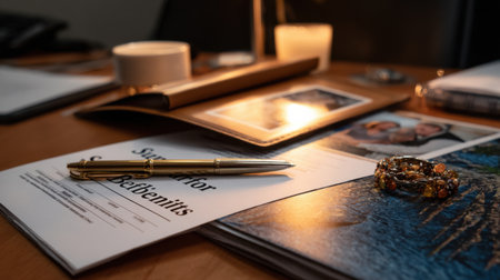Property release letterhead and gold-colored pen on gray table. A printed copy of a blank document. Selective focus.