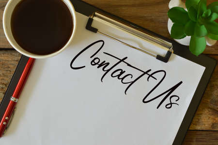Top view of plant, a cup of coffee and white paper written with text CONTACT US.