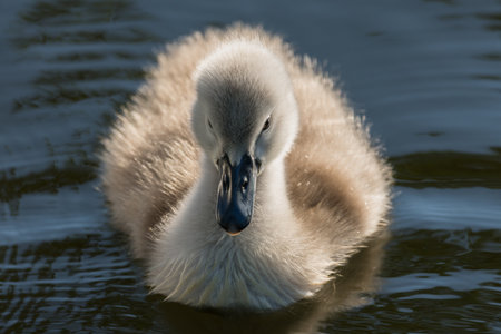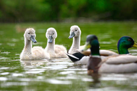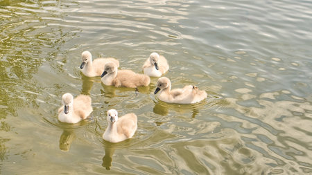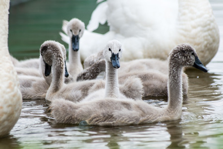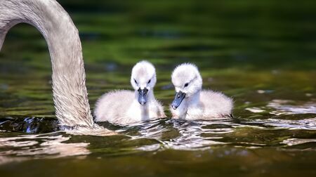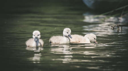Close up of newborn mute swan (cygnus olor) cygnets swimming in the water