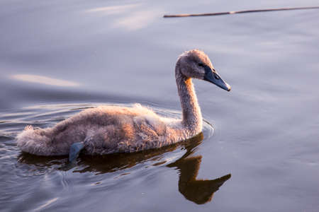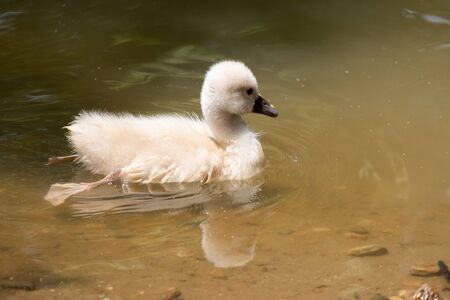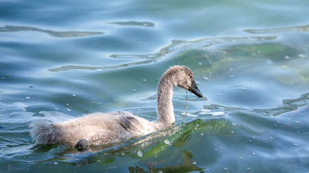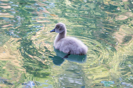 A baby swan swims on a lake on a sunny summer day. The baby swan is seven days after birth