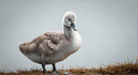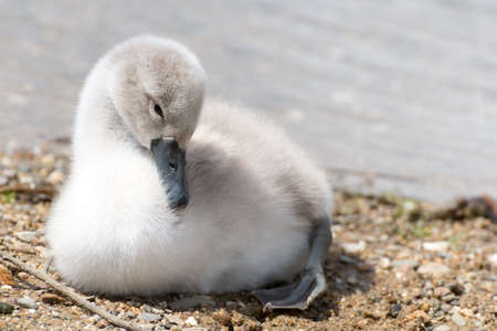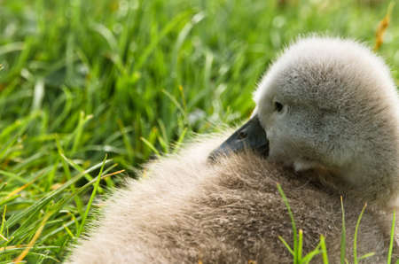 A close-up shot captures a young swan in a state of rest. The chick displays soft, light-colored feathers and a dark beak. The image uses a soft focus and gentle lighting, creating a serene atmosphere. This image is suitable for various commercial uses, including illustrations and educational materials.