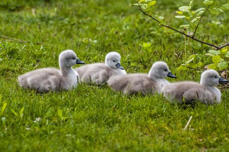 Adorable baby swan with open mouth and group of siblings on fresh green grass feeding themself