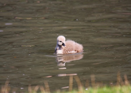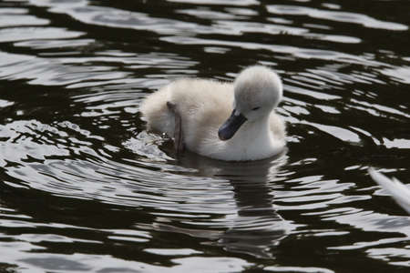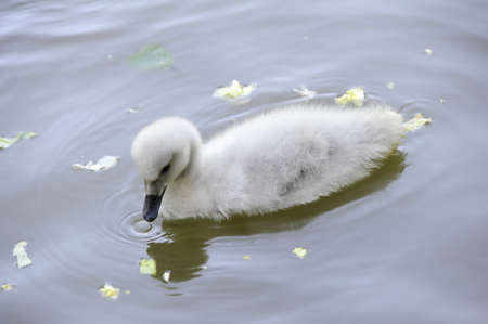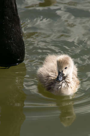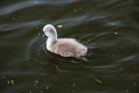 Single young mute swan (Cygnus olor) duckling on the water. Tired he fells asleep.