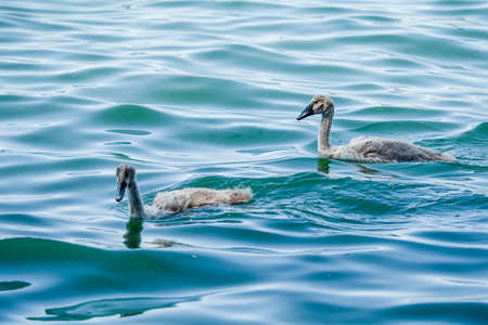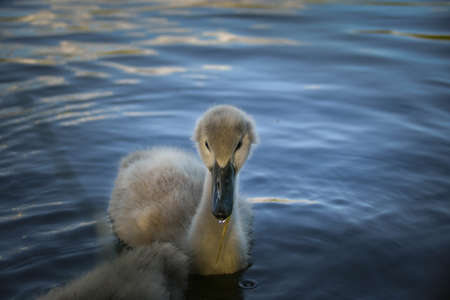 swan chicks in a lake. fluffy little birds. the fluffy little ones swim in the lake