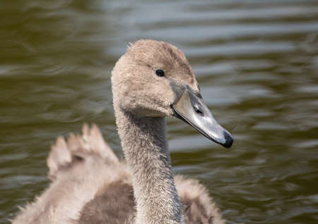 Portrait of a very small and fluffy little fledgling of a swan, just slipped, newborn, in profile with many details