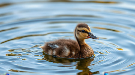 Young duckling swims gracefully in a serene pond surrounded by gentle ripples