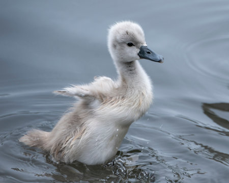 A young swan, or cygnet, splashes playfully in the water while flapping its wings. In the soft morning light, its downy feathers glisten as it explores the tranquil environment.
