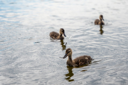 Three adorable ducklings swimming in a serene pond during sunny daylight hours