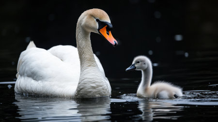 A mother swan is swimming with her baby swan. The baby swan is smaller than the mother and is following her closely. The water is calm and the sky is dark, creating a peaceful and serene atmosphere