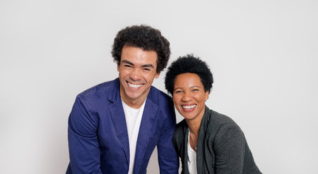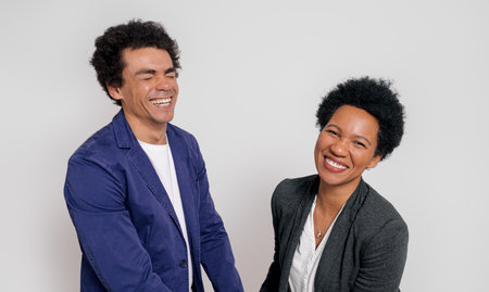Portrait of cheerful young colleagues with afro hairstyle smiling at camera over white background