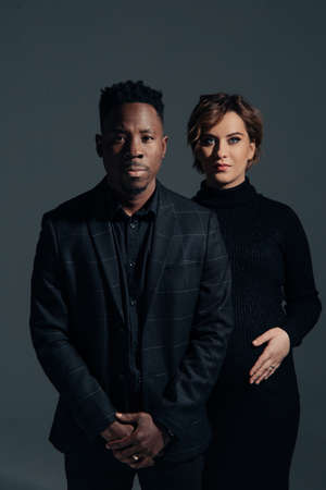 Young african man and his caucasian pregnant woman stand against gray background. Interracial marriage concept.