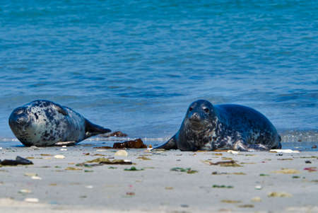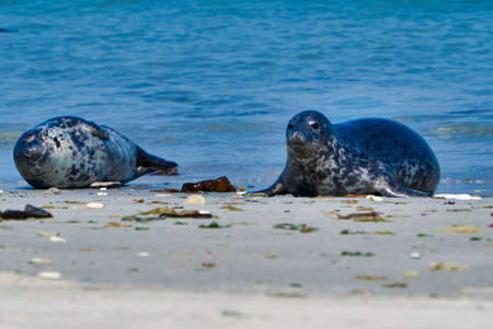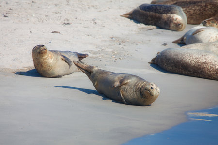 Grey seals, Halichoerus grypus, lying down on a beach of Dune island in Northern sea, Germany. Funny animals on a beautiful sunny day of winter. Wildlife of the north.