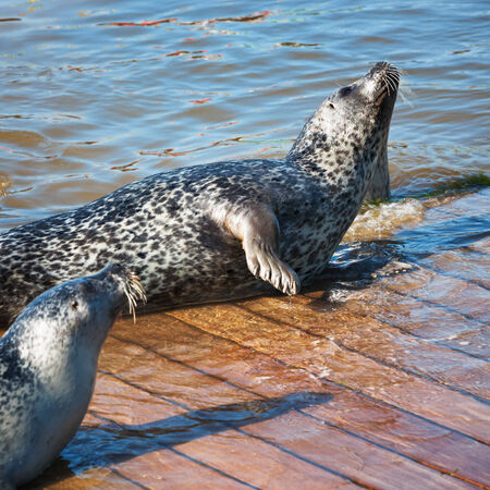 Harbor seals relaxing on wooden deck on sunny summer day. Animal themes. Wildlife. Selective focus