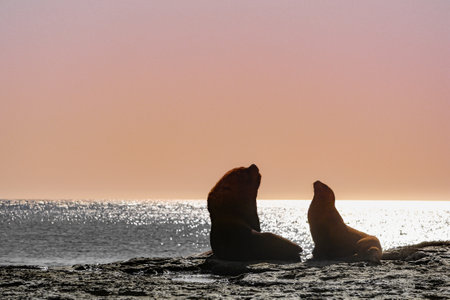 Silhouette of a couple formed by an adult male and female of South American sea lion also called southern sea lion and fur seal rest in a beautiful scenery during sunset in Peninsula Valdes, Argentina. Adult males usually weigh about 300 kg, twice than females