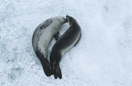 Two Weddell Seals (Leptonychotes weddellii) on ice view from above
