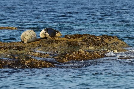 Iceland seals in the water. Relax on the seaweed. Rocks, animals in the habitat of nature Along the North Sea coast