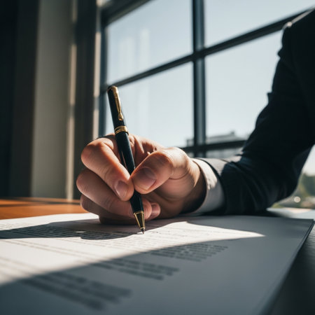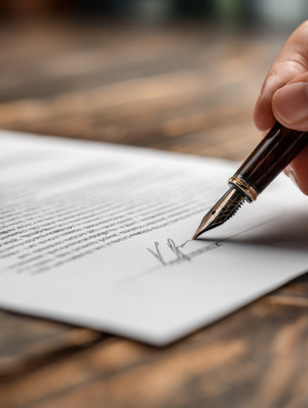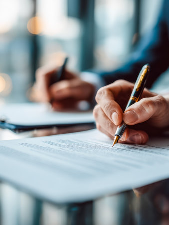 A hand is poised above a page with a fountain pen, about to sign a legal document in a well-lit office setting, surrounded by natural light.