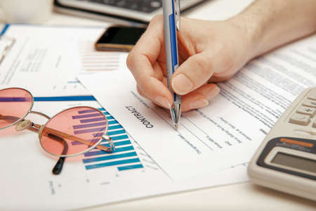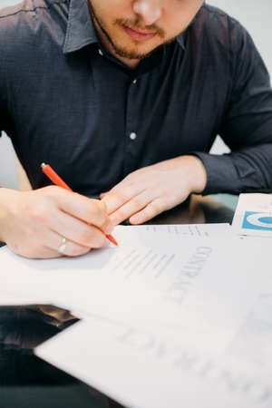 Filling out a business contract form. Man preparing to sign a contract. Transaction in accordance with the law, finance.