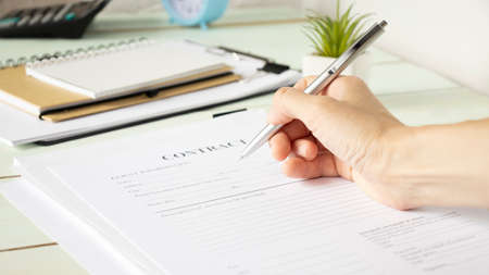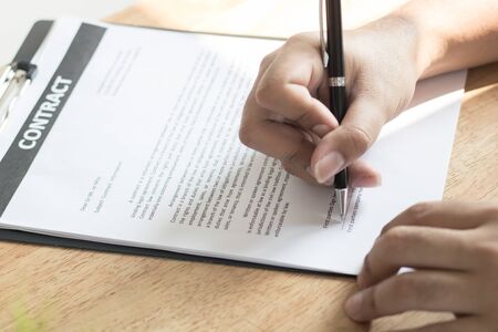 Close up hand businessman signing a contract legal for start up new project for investment. Contract Concept.