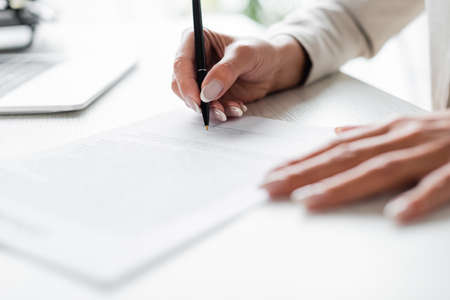 cropped view of businesswoman signing blurred document