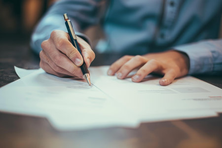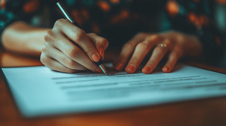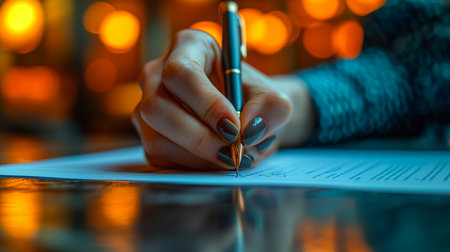 A person with well-manicured nails holds a silver pen, poised to sign a document on a wooden surface. The setting is bright, highlighting the focused actions of signing.