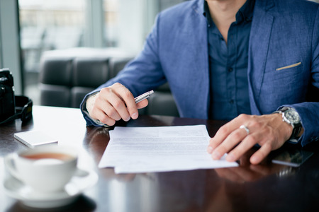 Close up of a man signing a contract at a coffee shop.