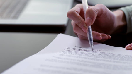 Woman signs a fake contract, close-up of hands with pen on paper with a contract. No faces, no confidential information, fake signature