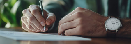 Close up of businessmans hands writing and signing a contract with elegant watch, showcasing professionalism and attention to detail in business dealings