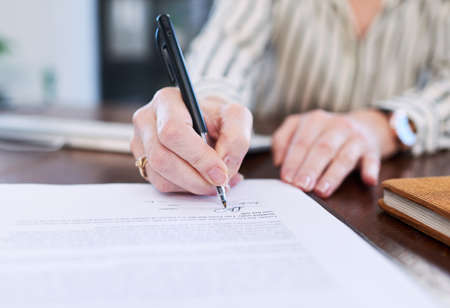 Close up of woman's hand with pen signing document, Deal concept
