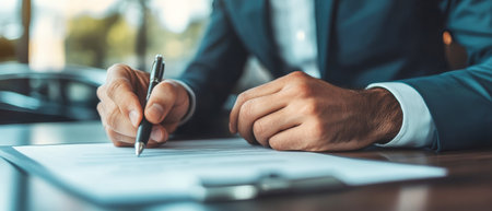 In a minimalist car dealership office, a male hand is signing a contract with a sleek pen, symbolizing the excitement of acquiring a new vehicle.
