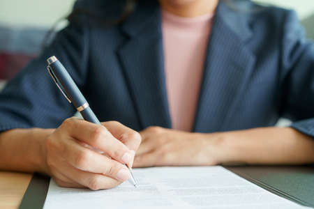 woman's hand hold ballpoint pen writing on agreement paper sheet, fill in document template, applying for mortgage loan