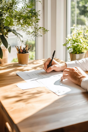 In a sunlit and inviting farm office, a farmer focuses on signing essential certification papers. The rustic desk is adorned with plants, highlighting a connection with nature and hard work.