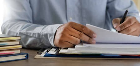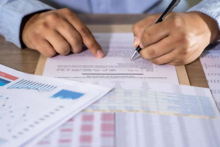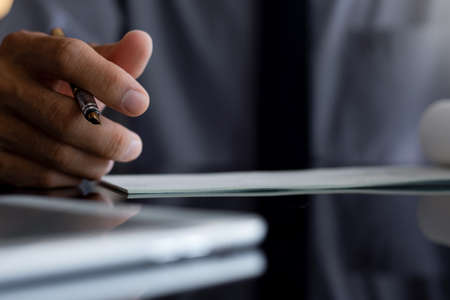 Closeup business man sign and write cheque documents on the desk at office.