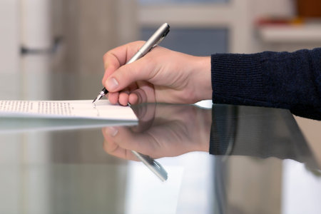Hands of man signing formal paper Close-up image of male hands keeping stylish fountain pen and signing agreement on glass table with reflections