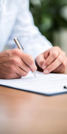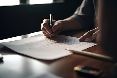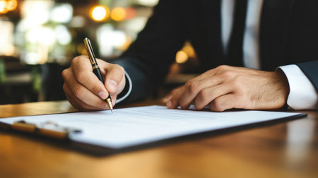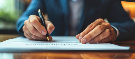 A close-up view of a hand gripping a pen while signing an important document on a wooden table, capturing the essence of professionalism and responsibility.