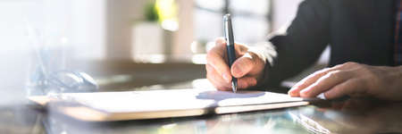 Close Up of Businessman Writing on Paper with Pen