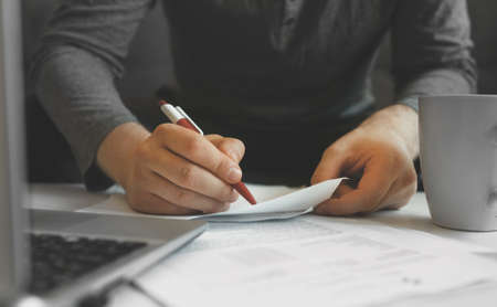 Closeup of business man making notes on sheet of paper. Entrepreneur standing and working at office desk. Paperwork concept. Cropped front view.