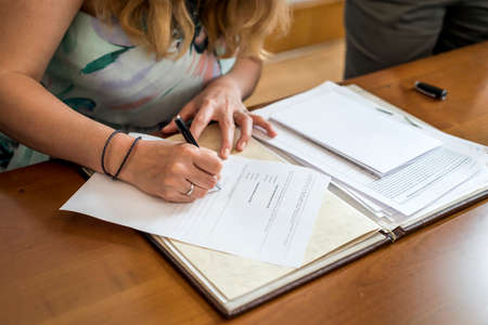 marriage elegant bride signing register, holding pen and official document wedding couple