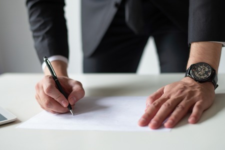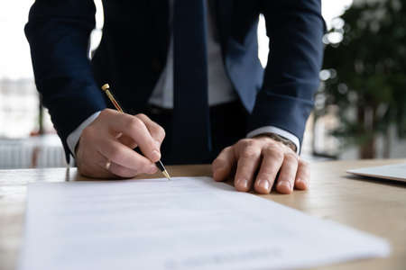 Crop close up of male CEO or boss in suit stand in office put signature on paper document making agreement. Businessman sign paperwork close business financial deal at workplace. Legislation concept.