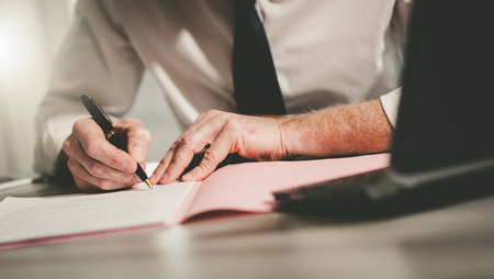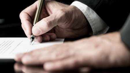 Businessman standing at his desk leaning to sign legal document or paperwork with fountain pen.